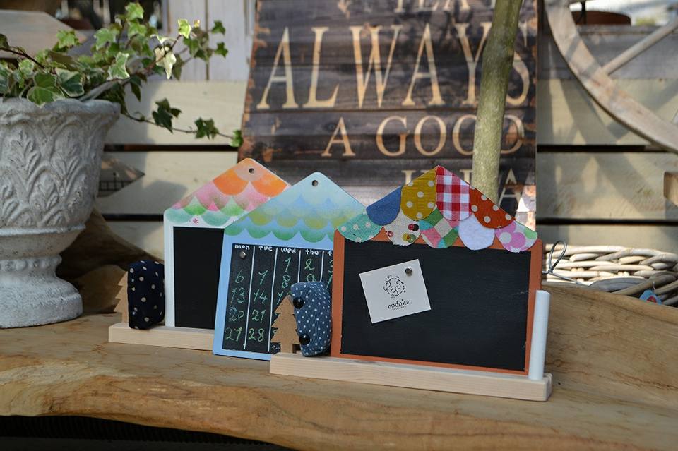 子供も大人も簡単にできる、おうちの形の小さな黒板作りのワークショップです。ハギレやステンシルで屋根の模様を作ります。